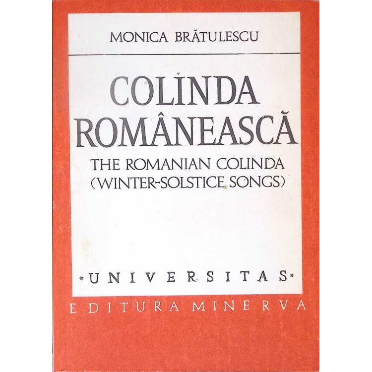 Aceasta carte "COLINDA ROMANEASCA" scrisa de autorul(i) MONICA BRATULESCU a fost publicata de editura MINERVA in anul 1980. Cartea este scrisa in limba romana si are 349 de pagini cu coperta tip Necartonată (Paperback). Cartea are urmatoarele dimensiuni 14.0 cm x 20.0 cm x 1.5 cm (Lungime x Latime x Inaltime)