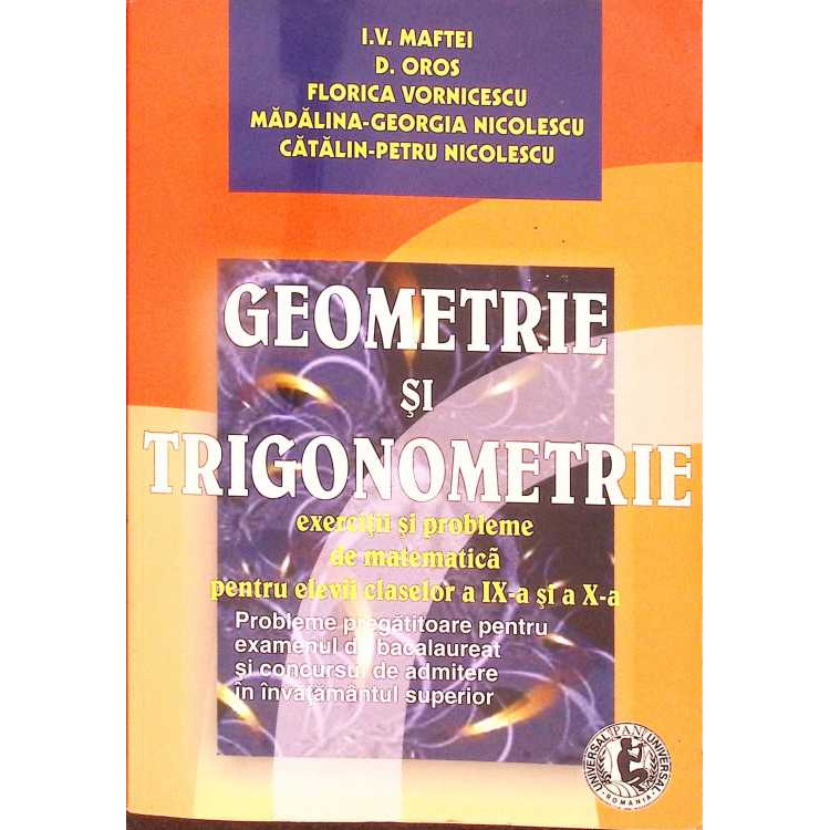 Cartea "GEOMETRIE SI TRIGONOMETRIE, EXERCITII SI PROBLEME DE MATEMATICA PENRU ELEVII CLASELOR A IX-A SI A X-A" scrisa de I.V. MAFTEI, D. OROS, F. VORNICESCU SI COLAB.